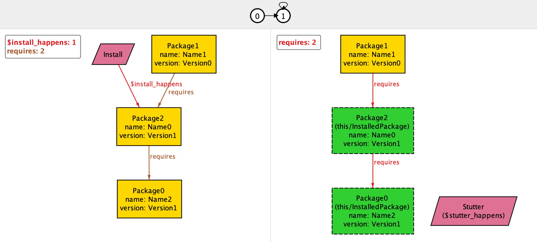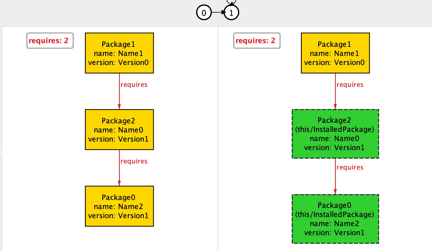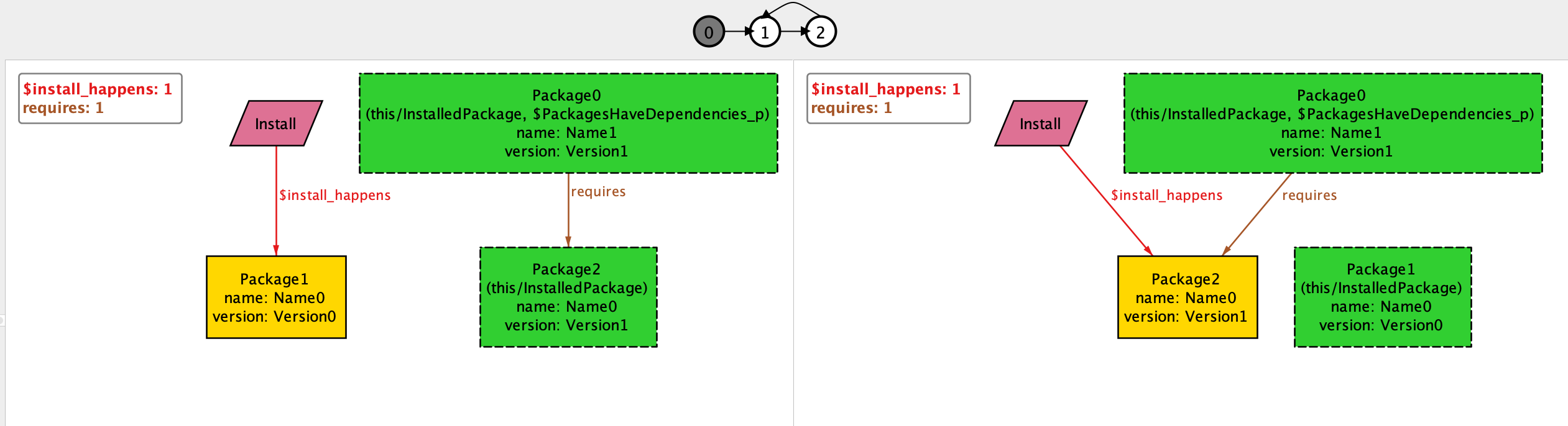The left boxes are time 0 and the right are time 1. We know this means we’re installing Package2, and hence Package0, but it’s a bit hard to interpret this. We use a trick to make the events appear explicitly by adding: